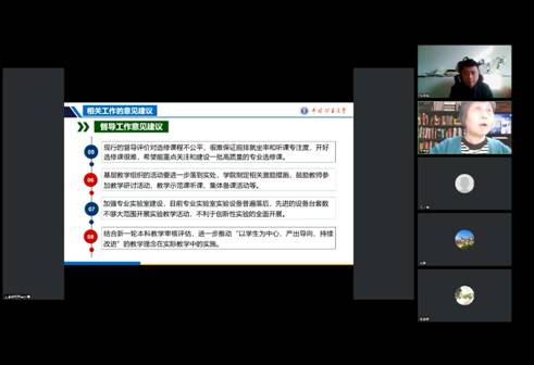 王香婷老师首先代表学院督导专家组对2022-2023-1学期期中教学督导工作进行总结,并对学院教学工作提出了宝贵意见建议。王老师指出在本学期多次线上线下教学模式转换的情况下,学院教师能够及时作出调整按要求开展教学,熟练运用智慧教育平台和现代化教学手段有效组织课堂教学。在今后的课堂教学中,希望教师在讲授知识的同时注重对学生能力的培养;精炼讲课内容提高课堂效率、运用信息化手段开展更加深入的课堂互动;进一步提高全英文课程的教学效果,做到专业知识、专业英语能力切实提升;进一步提高课件制作、课程导入设计、重难点知识归纳等教学环节的规范性;拓展学生学习空间、促进学生自主学习能力提升,结合新一轮本科教学审核评估,进一步推动以学生为中心、产出导向、持续改进的教学理念在实际教学中的实施,不断提高人才培养质量。
