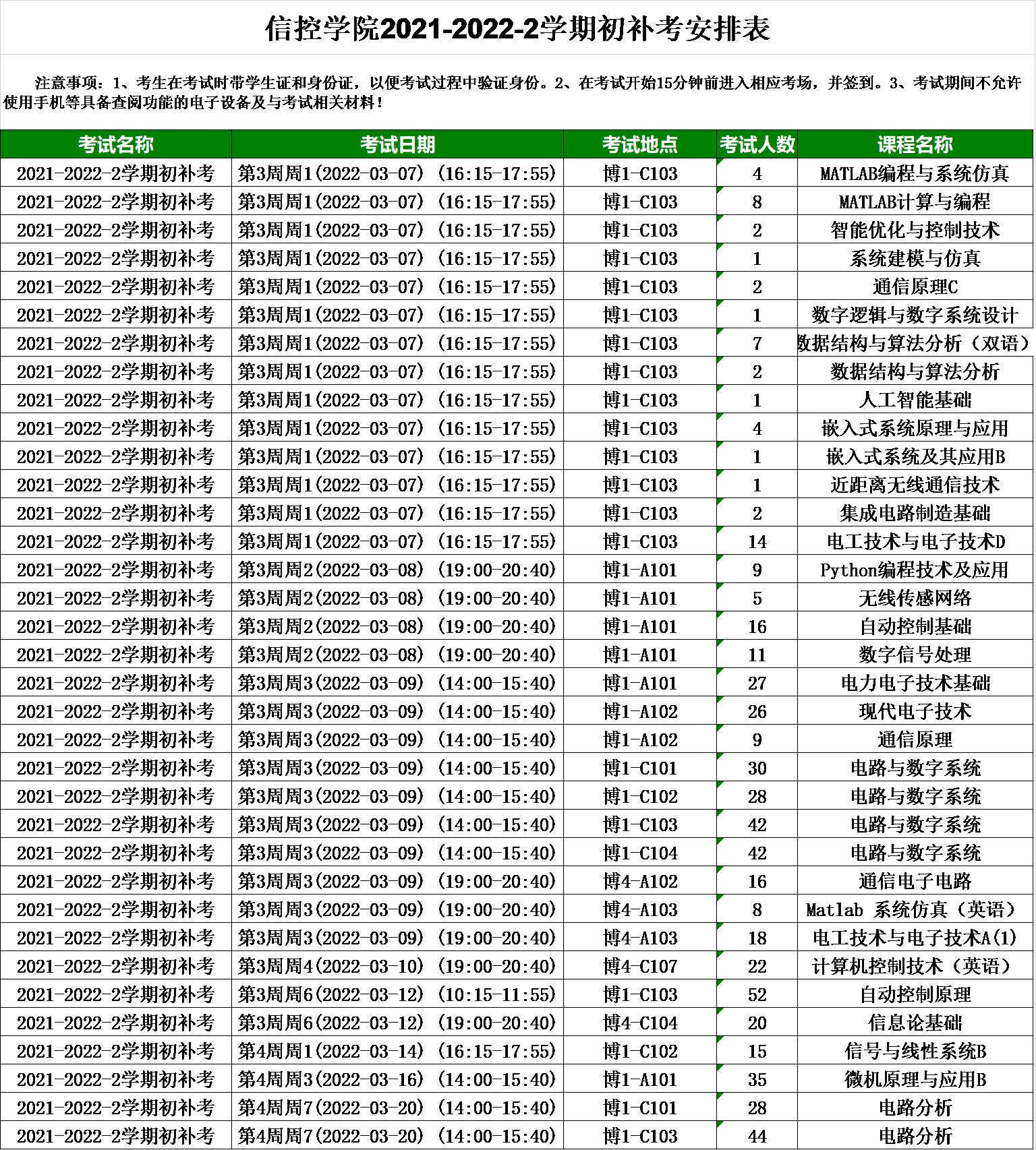 信控学院2021-2022-2学期初补考安排如下,具体到每位同学的考试时间及地点请登陆教务系统进行查询。