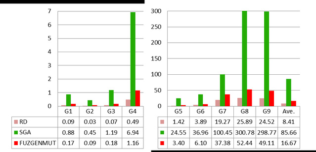 随机方法、单种群遗传算法和所提方法生成测试数据时的时间消耗
