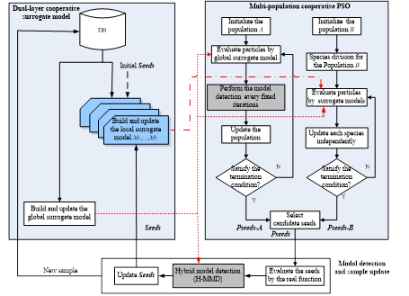 为在降低计算开销的同时获取多个同等重要的优化解,该论文引入了一种双种群协同粒子群优化机制,其中种群A用于探索新模态,而种群B侧重同时开发多个已知模态,有效均衡了算法的探索与开发能力。同时,提出的多模态引导的双层协同代理模型,不仅同时兼顾了两个种群对粒子预测精度的不同需要,而且有效降低了进化过程中粒子的评价耗时。此外,给出的基于聚类和插值的混合模态检测策略,可以帮助算法以较少的计算代价不断发现新的模态。