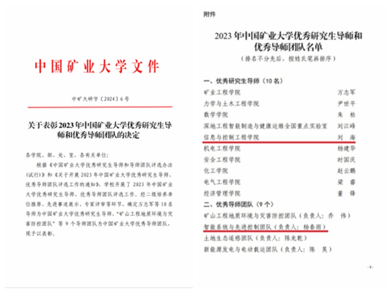 刘海教授荣获2023年校级“优秀研究生导师”称号,杨春雨教授负责的智能系统与先进控制团队荣获优秀导师团队。