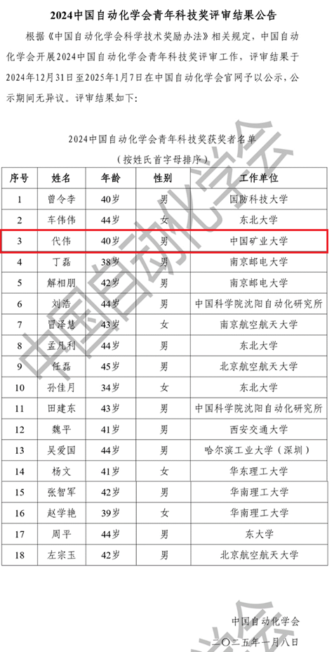 近日,中国自动化学会网站公布了2024年度中国自动化学会青年科技奖评审结果,禁忌书屋 代伟教授获此荣誉,系禁忌书屋 教师首次获得此项荣誉。