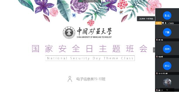 为进一步增强同学们的国家安全意识,提高防范和抵御风险的能力,2020年4月14日,信控学院电子信息类19-10班召开“415国家安全日”线上主题班会。班长陈乾泓主持会议,,班级全体同学参会。