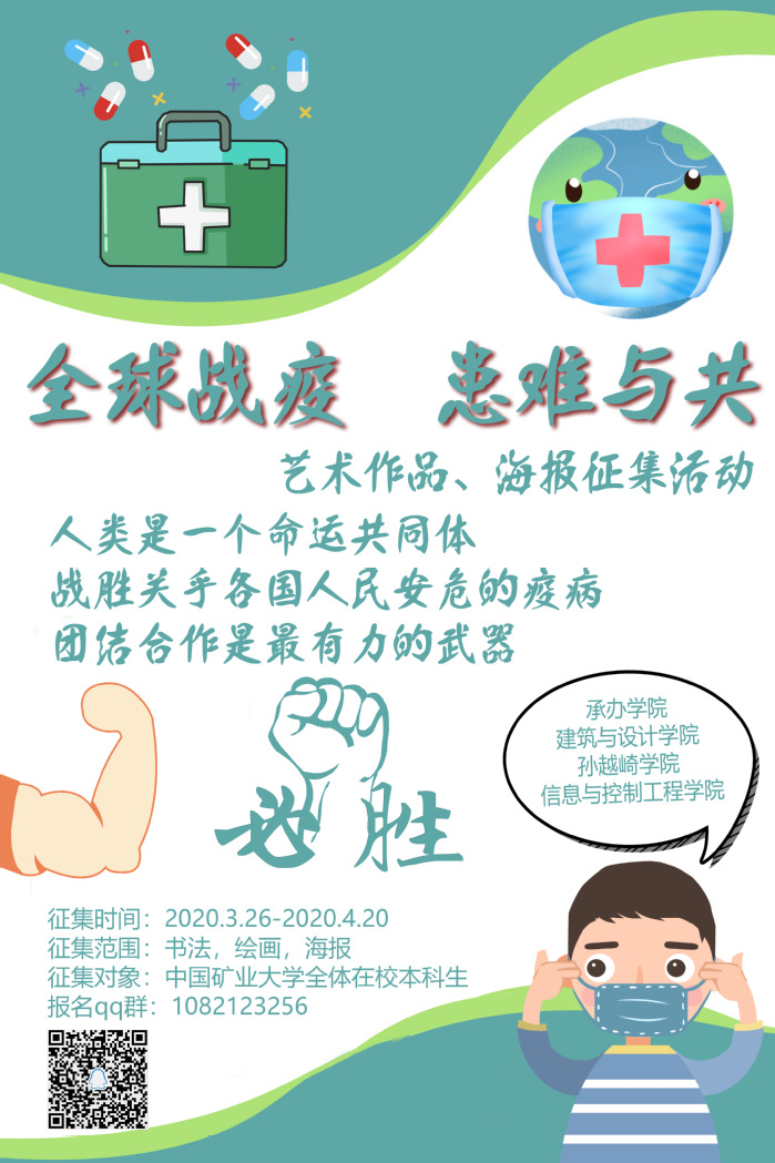 为加强新型冠状病毒的宣传,增强人们对新型冠状病毒的认识以及战胜病毒的信心,信控学院大学生传媒中心联合建筑与设计学院、孙越崎学院举办“全球战疫,患难与共”海报书法比赛,本次活动面向禁忌书屋 全体学生,作品征集从326日开始,430日结束。