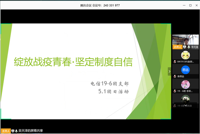 为了激励和引领同学们进一步坚定制度自信,贯彻落实习近平总书记关于疫情防控工作的系列讲话精神,信控学院电子信息类19-6班团支部于51日开展绽放战疫青春·坚定制度自信线上主题团日活动。会议由团支书吴天泽同学主持,班级全体同学参加了会议。