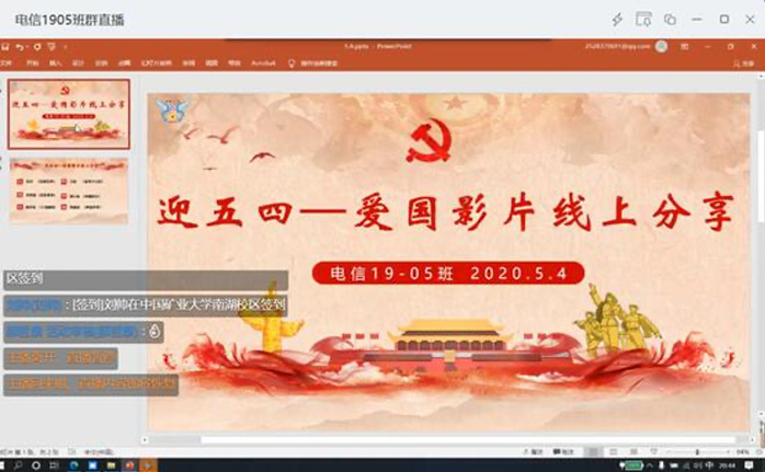 为引导同学们弘扬五四精神,积极承担历史使命,珍惜时代赋予我们的责任,贡献自己的青春力量,54日晚,电子信息类19-05班举行了“迎五四-爱国影片线上分享”主题团日活动。