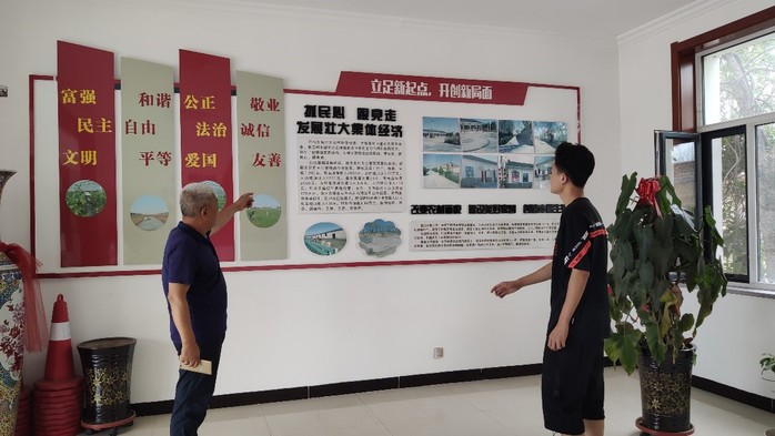 8月7日上午,实践团队成员李瑛琪抵达谢店村,与村委会书记王有同志会面,阐明了此次调研的内容及时间安排,表达了进行深入基层、实地考察的愿望。王有书记向李瑛琪同学讲述了谢店村近年落实脱贫攻坚政策采取的措施及成果,从农业设施升级换代到信息化奶牛养殖等生产基础建设的完善,从扶贫兜底摆脱生存困境到教育大业等民生问题的解决,村子已经有了翻天覆地的变化,村民们稳步走上小康路。王书记表示,尽管已经取得了一定成效,但当地与小康生活标准仍存在差距,谢店村将继续围绕巩固产业发展、改善民生两个方面采取措施进行精准扶贫工作。