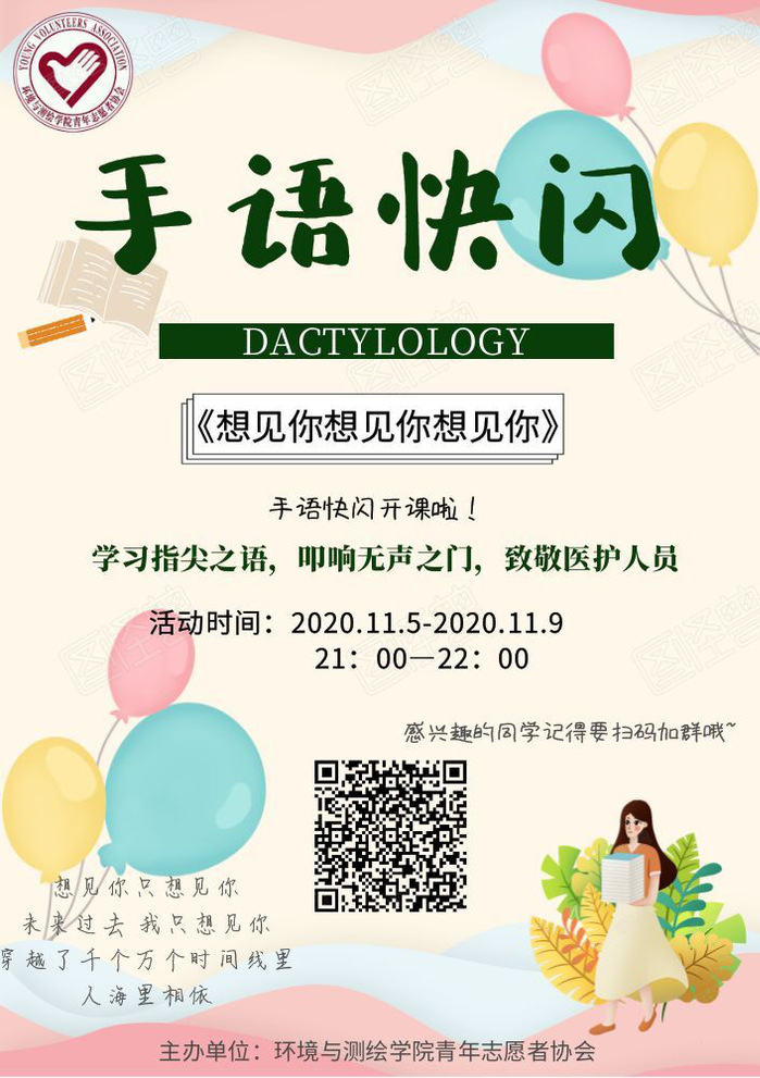 为了更好的推广手语,让同学们更多的关注聋哑人群体,同时通过手语课堂,向疫情中为我们建起坚实壁垒的医护人员传达感激与敬意。信控学院锋行青年志愿者协会举办了“同你在一起”授予课堂系列活动,活动一经召开,就获得了同学们的热烈支持。