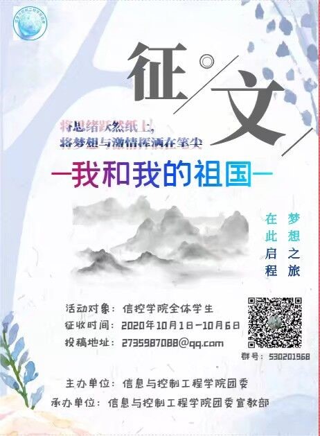 为激发同学们的爱国热情,弘扬爱国主义精神,进一步增强对祖国的热爱,在祖国七十一周年华诞之际,信控学院开展了“我和我的祖国”线上征文比赛。本次比赛由信控学院团委宣教部主办,面向信控学院全体学生,活动时间为10月1日到10月6日。