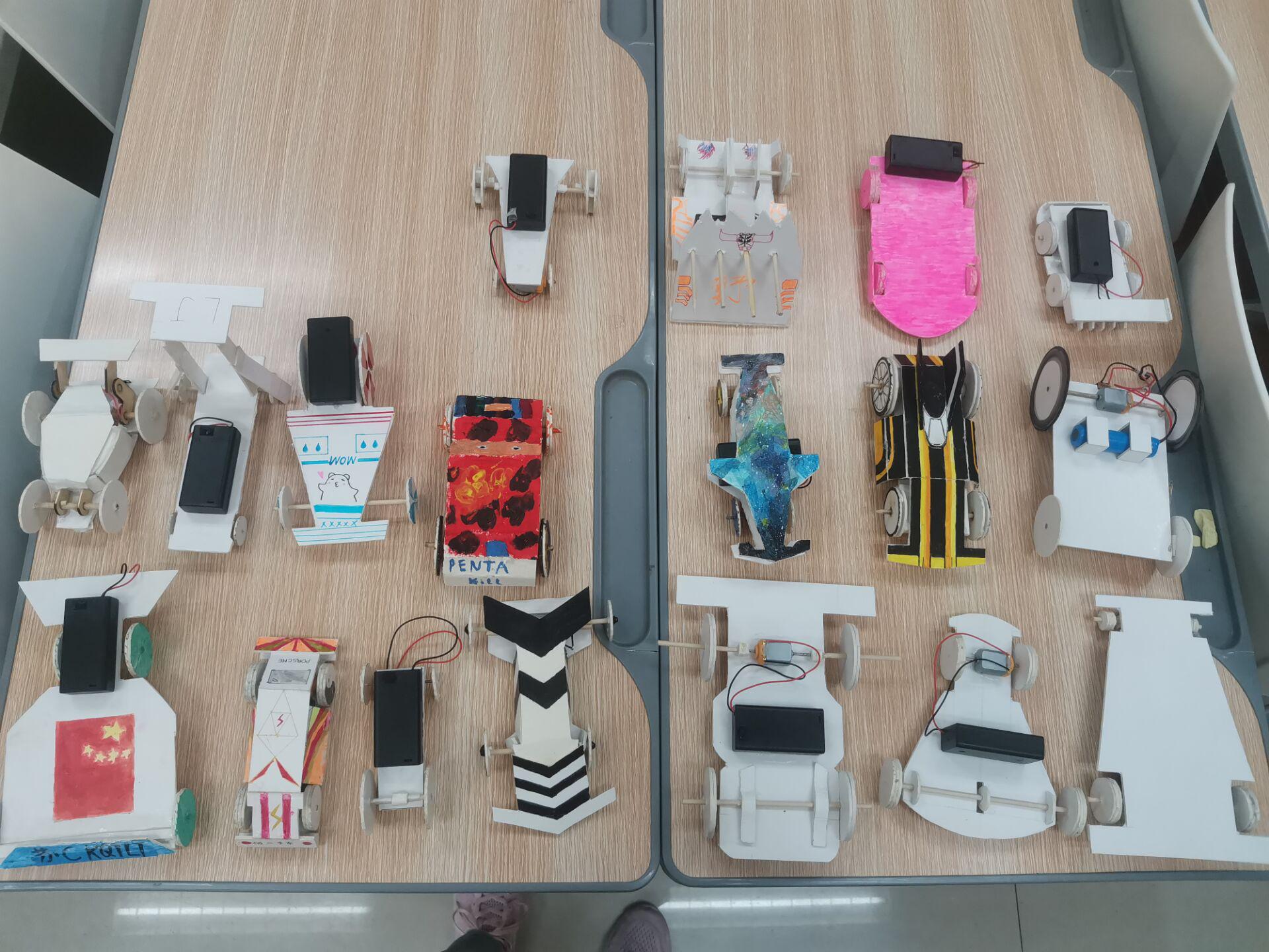 团委科技创新部的活动负责人对此活动进行了宣传,吸引了许多对活动感兴趣的同学参加。参赛选手4人一组,利用举办方提供的材料制作参赛小车,为了能够在此次活动中脱颖而出,学生们也积极备战,精心制作出了形态各异的小车,在比赛当天带到了现场。本次比赛主要分为速度测试和保龄球比赛两个部分。首先,参赛作品将进行速度测试,参赛组调整好本组赛车后,将赛车放置在规定跑道进行速度测试;然后,各组参加 “保龄球”比赛,赛车由指定区域出发,冲向摆成一排的瓶子,以最终撞倒的球瓶数量多少计分。最后,活动举办方将综合外观和比赛成绩评选出获奖作品并颁发奖状。