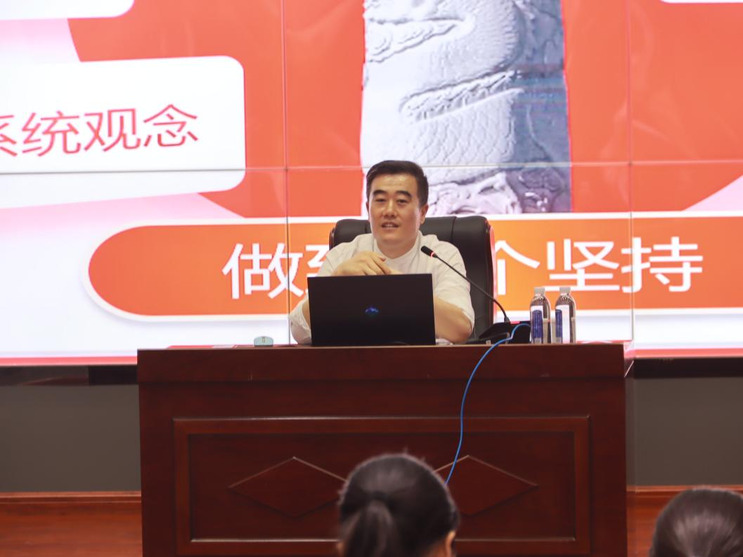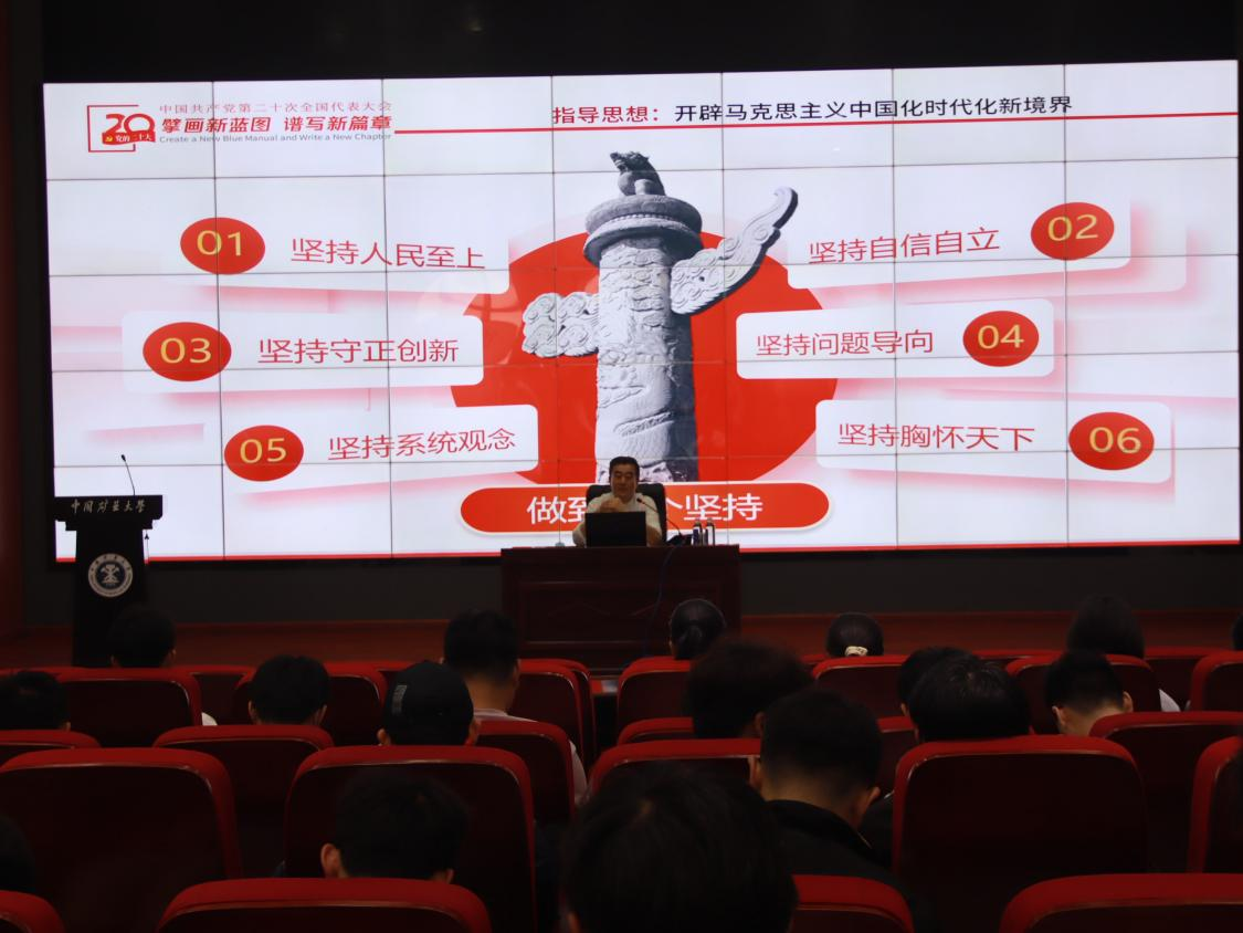 于基伯副书记以企业与学校的联系为引展开报告,从大会概况、成就经验、指导思想、使命任务、战略部署、学习贯彻等六个方面深入阐释了党的二十大精神。在报告过程中,于基伯副书记结合具体实例与自身经验详细解读了党的二十大精神与日常生活的联系,并多次强调,同学们应将党的二十大精神熟记于心,争做有理想、敢担当、能吃苦、肯奋斗的新时代好青年。
