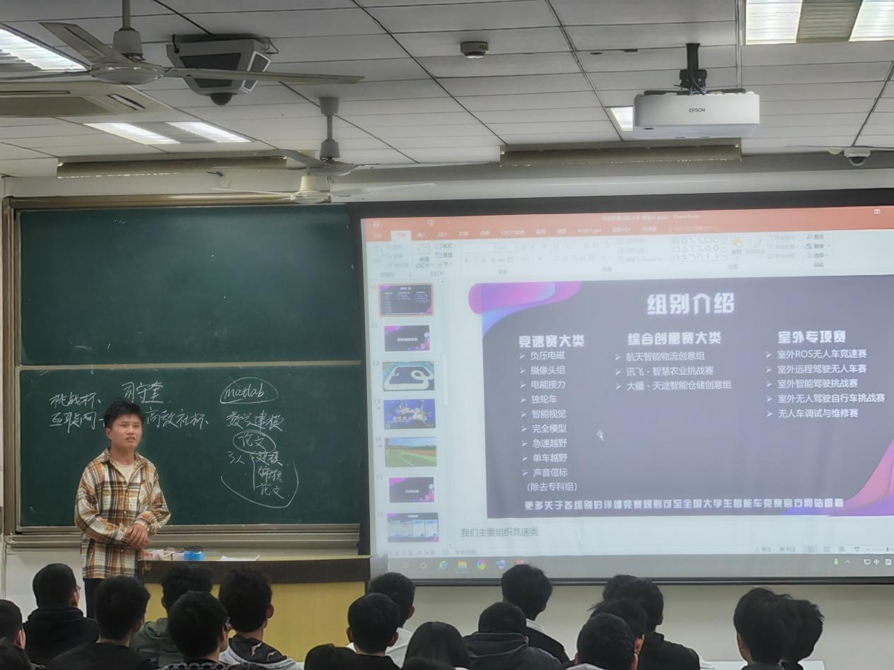 赵嘉田同学简要介绍了大学生电子设计竞赛的参赛经历,分享了在实践过程中遇到的一些多领域交叉、系统复杂度较高难题的解决方案。唐加乐同学介绍了大学生智能汽车竞赛的基本信息、纳新培训计划等,强调了各类调参方法和编程能力的重要性,分享了自己制作过程中的心得体会以及所取得的成果。分享结束后,赵嘉田和唐加乐回答了与会同学们提出的相关问题。