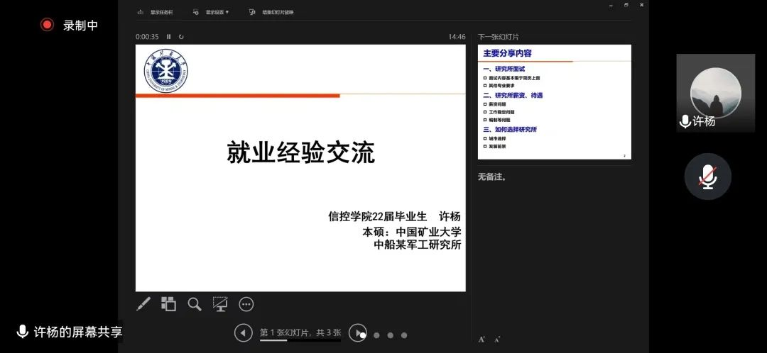 为开阔学生视野,提升就业能力,信控学院研究生会于2022年11月13日举办就业分享交流会。本次交流会采用线上方式进行,邀请阁智祺、许杨、徐杰三位优秀毕业生做就业经验分享。