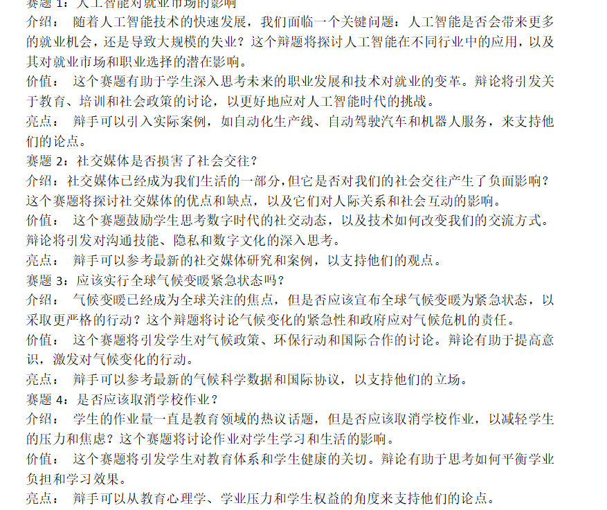 活动得到了同学们的积极响应,大家于线上踊跃报名并积极加入相关活动群。参与者或从自身经验出发,深入探讨热门话题,如人工智能对就业市场的影响;或巧妙结合古文,自主创造新颖辩题,如亡斧者应不应该提出猜忌质疑。活动后期,学院学生会对征集辩题进行了审核筛选,以便为校辩论赛提供辩题。
