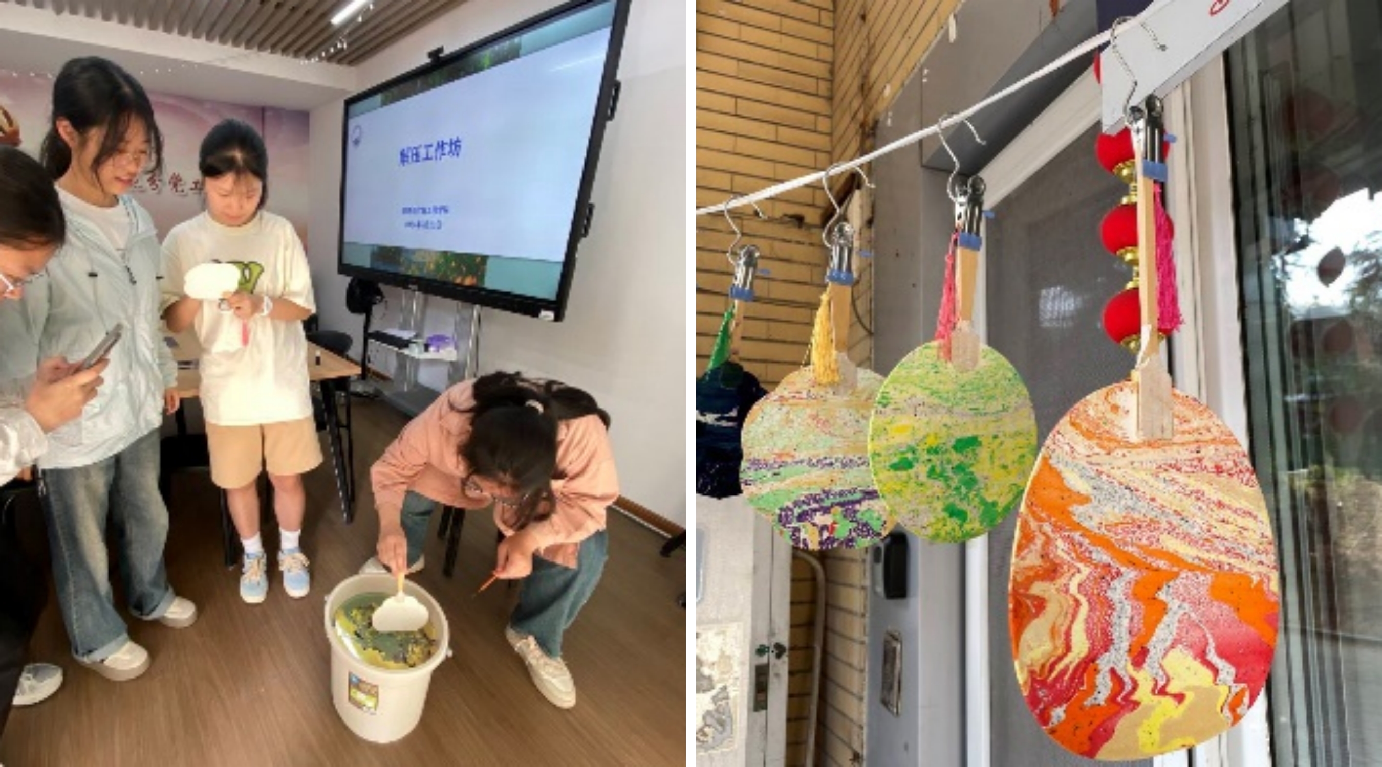 活动开始前,志愿者讲解了漂漆扇的制作过程,并进行现场示范。讲解示范后,在志愿者的协助下,同学们首先调漆,DIY出自己心仪的色彩搭配;随后,将白扇缓缓放入漆桶,或旋转,或轻摇,以不同的摆动方式和幅度获得独一无二的图案,每一个环节都考验着同学们的耐心与技艺。等待漆干燥之后,一把把绚丽多彩的漆扇呈现在大家眼前,同学们纷纷拍照留念,并互相分享制作经验,现场气氛热烈而和谐。整个过程,同学们认真细致,互帮互助,展现出良好的团队合作精神。