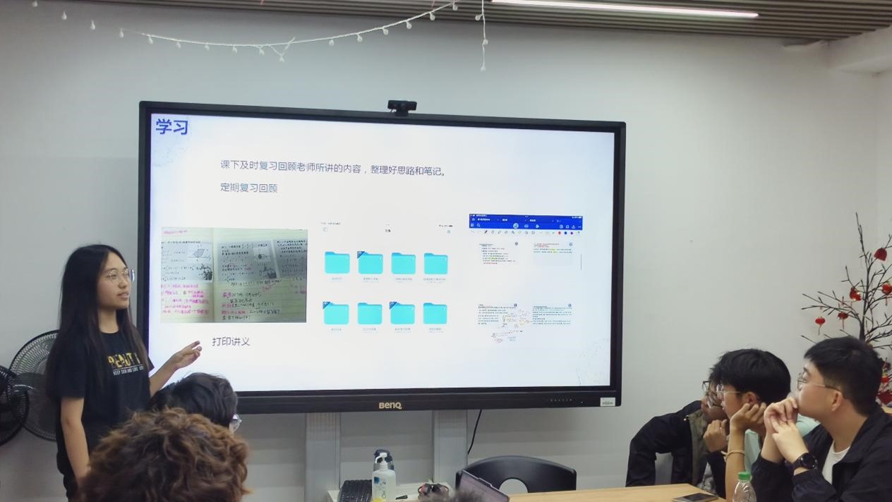 于思宁同学重点分享了课程学习的方法和需要注意的问题。她强调了笔记的重要作用,她表示,课堂笔记不仅对提高课堂学习效率和深度理解课堂知识有着积极的作用,还有助于同学们课后梳理课程知识,进行复习,形成系统的知识体系。