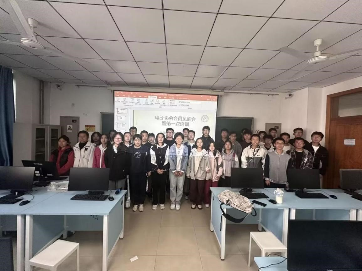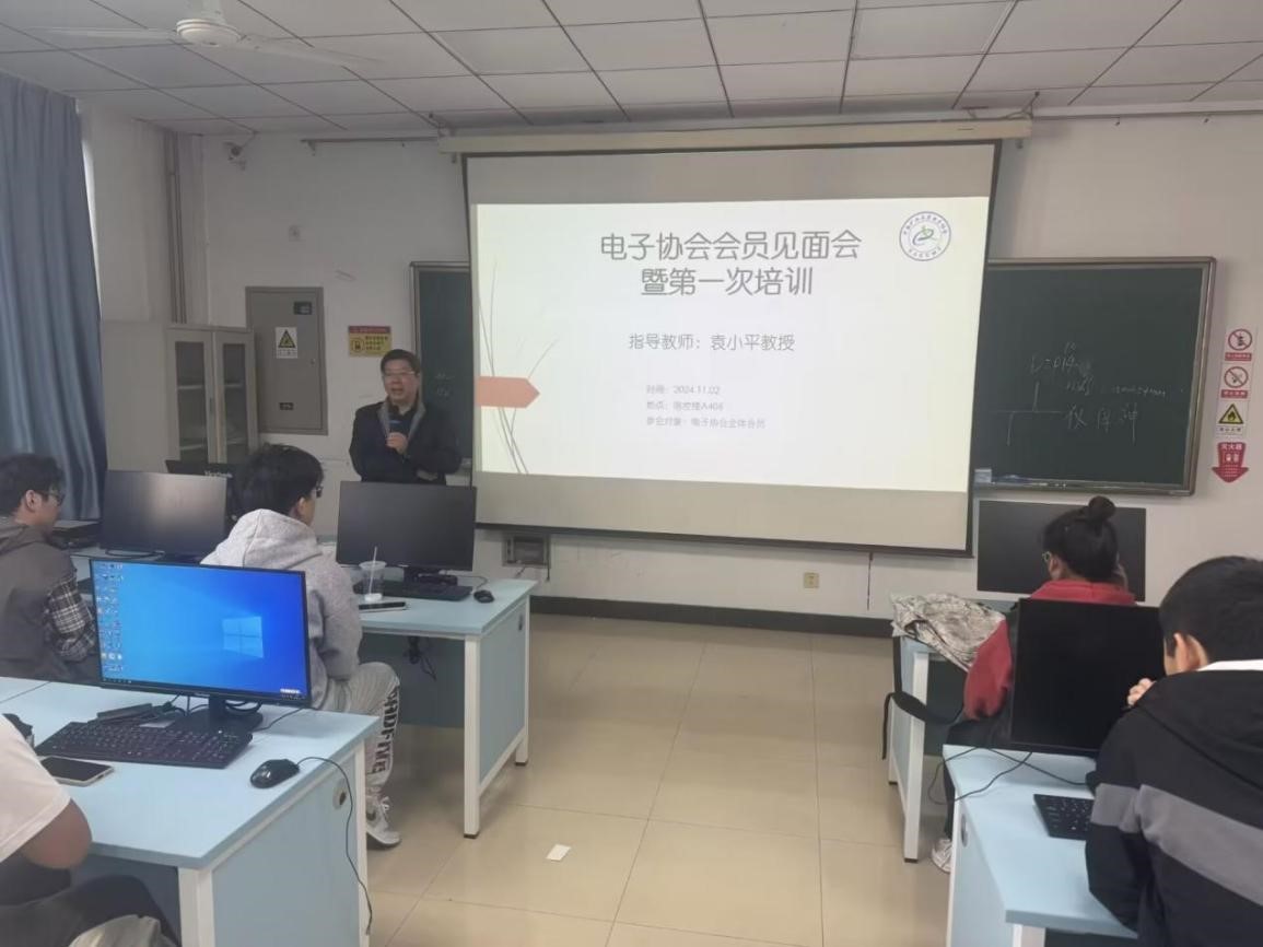 电子协会在信控学院楼举办2024-2025学年见面会暨首次培训会,电子协会业务指导教师袁小平教授出席会议并讲话,电子协会新成员参与本次活动。