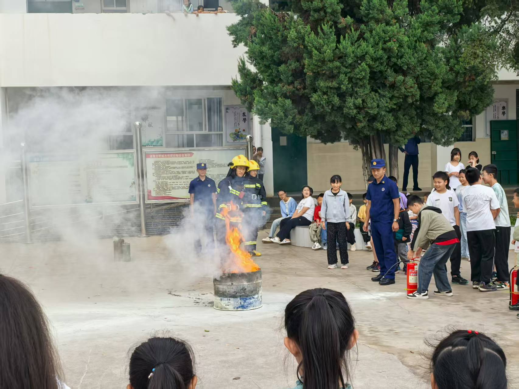 消防员引导学生正确使用灭火器