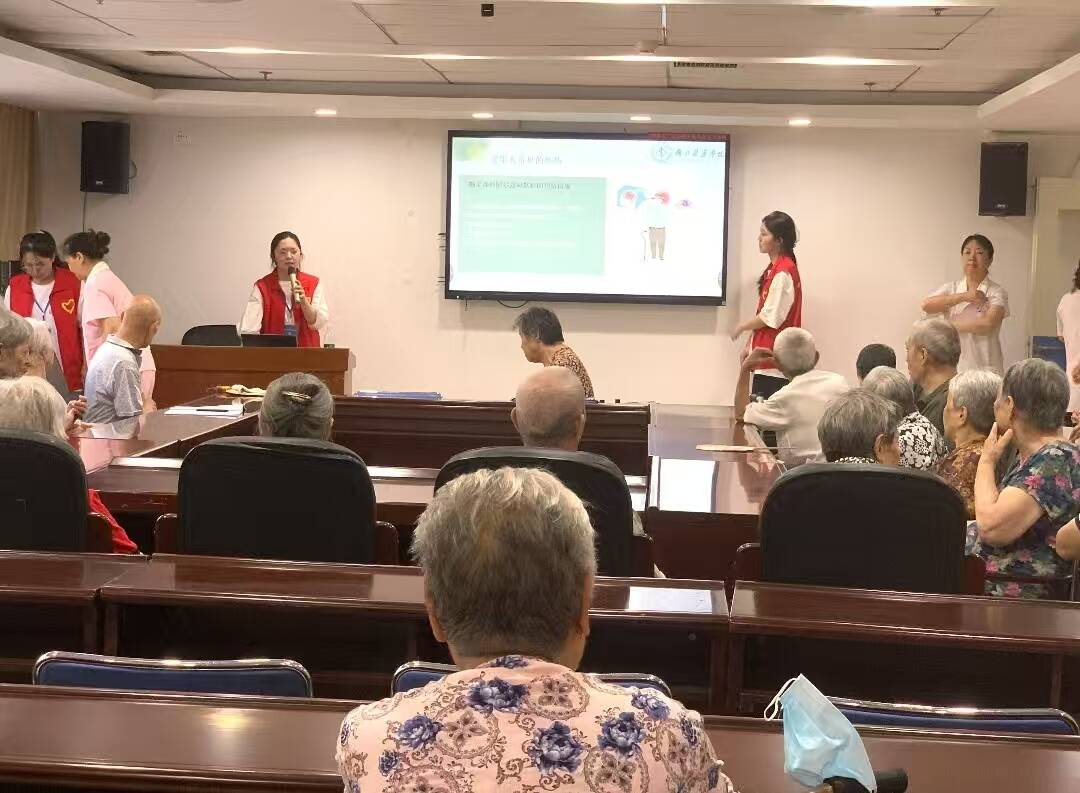 讲座中,成员通过案例和图片,向老人们介绍了老年痴呆的常见症状、发病原因以及对发病后的不良影响,让老人们对这一疾病有了更清晰的认识。随后,成员讲解了防范老年痴呆的有效方法。团队结合老年人生活习惯,用通俗语言讲解了每种预防方法以及注意事项,例如多摄入鱼、蔬菜等营养食材,坚持散步、太极等运动,积极参与社交以及下棋、读书等脑力活动。