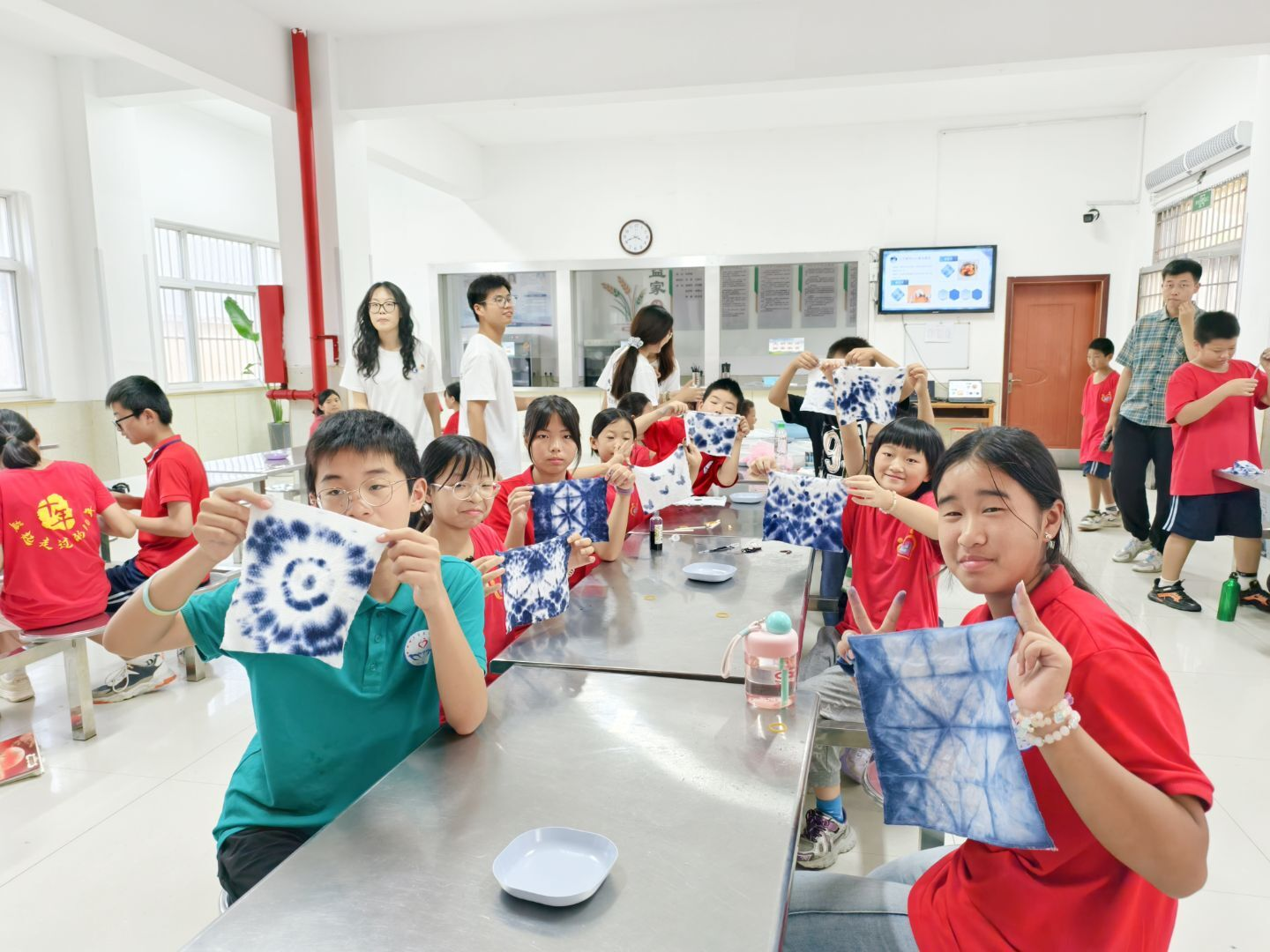 支教团首先带来《探索激光与智能的奥秘》实践课。支教老师借用机器人“小智”现场演示前进、转圈、空气质量检测等指令,把单片机、传感器等抽象概念转化为“大脑”“眼睛”,并借助放大镜聚焦阳光灼烧木片,直观展示激光能量集中原理,激发了学生探索科学的兴趣。《扎染与生活》课堂则将非遗蓝印花布引入教室,孩子们在支教老师指导下完成螺旋扎结、靛蓝浸染、氧化显色等工序,亲手制作出独一无二的手帕,感受传统工艺之美。