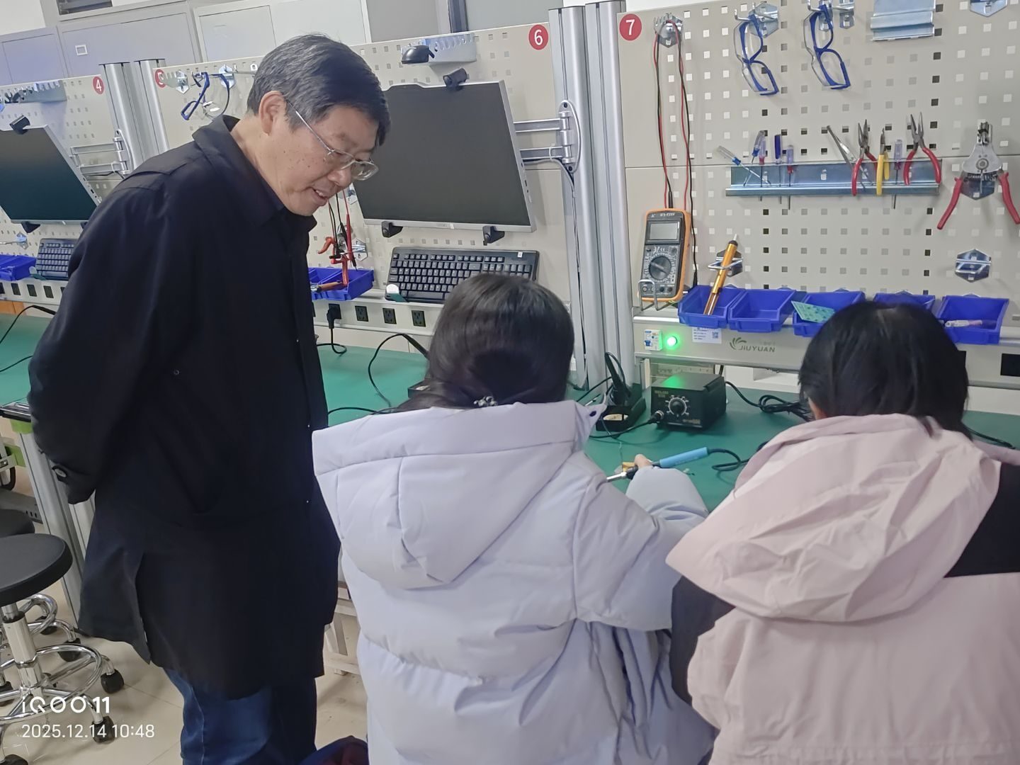 12月14日,信控楼A505开展焊接培训。电子协会筹备并发放贴片焊接练习套件与复赛元器件,袁小平教授现场指导。协会副主席罗沈杨主讲烙铁焊接贴片元件的方法,同时介绍了贴片SMT工艺在工程生产中的应用,为复赛焊接环节筑牢基础。