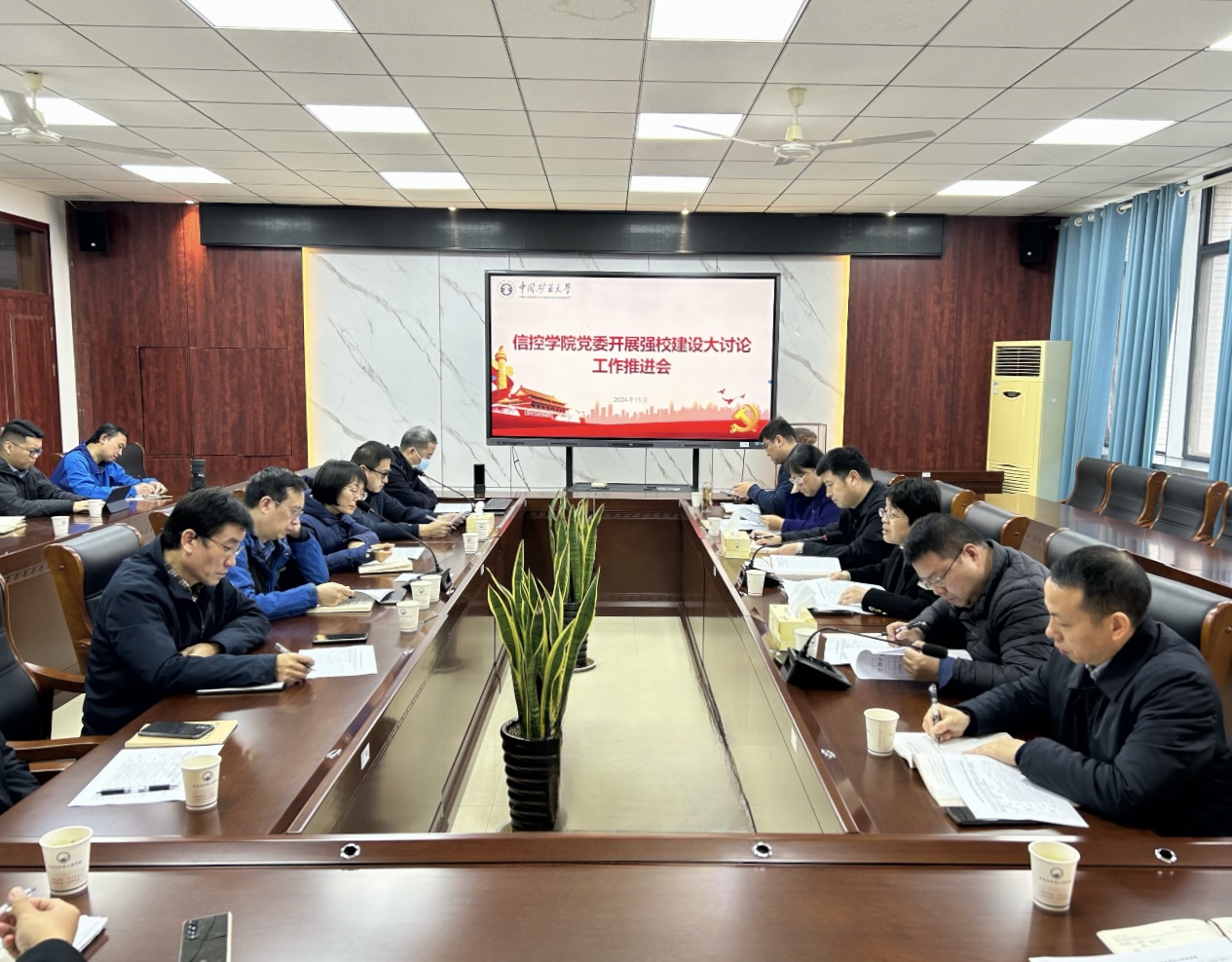 强校建设大讨论实施方案〉的通知》文件精神,11月25日上午,信控学院党委在A311会议室召开强校建设大讨论工作推进会。学院党委书记程德强,院长王雪松,党委副书记翟文艳,副院长刘海、陈平、代伟,物联网(感知矿山)研究中心副主任查振高,教师党支部书记、各中层机构负责人参加会议。会议由学院党委书记程德强主持。