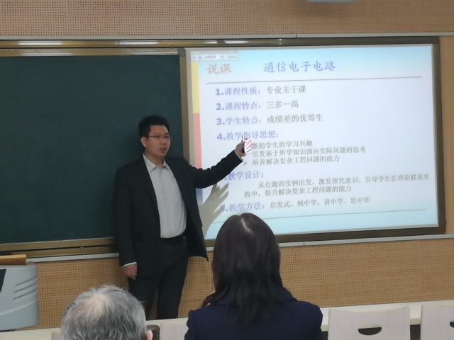 据悉,本次竞赛的形式是教师以公开讲课的方式集中进行的,教学竞赛评审工作组专家根据评分标准现场打分。参加本次比赛的每位教师需提前准备好一个参赛内容并提交相应的教案,比赛时需采用板书和课件相结合的教学方式讲课30分钟(前5分钟为说课)。早上8点30分,教学竞赛正式开始。第一位进行教学讲课的教师是赵峻老师,赵峻老师主讲的课程名称是《电子技术》,具体的教学内容是“零输入响应”。在谈及教学内容背景时,赵峻老师谈到了两个教学问题:一是教师在教学过程中遇到概念相对泛化时应当注意到的“如何具体化”的问题,二是教师在教学过程中应当协调好教学内容轻重的问题。谈完这些问题后,赵峻老师正式开始课程教学。在一番生动而不失细致的教学结束后,李雷老师、叶宾老师等教师分别按照顺序上台进行教学讲课,在讲课过程中,每位老师都展示了其扎实的教学功底与出色的学科素养。