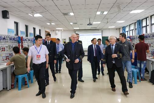 先进自动化技术实验室、电工机组实验室等,了解了学院与“西门子公司”联合共建综合自动化实验室和培训基地的先进实验仪器、创新实验课程开设等情况,询问技术人员自主研发仪器设备及服务全校量大面广的工科非电类专业电工学实验情况,还与正在实验的国际学生和指导教师等进行交流。