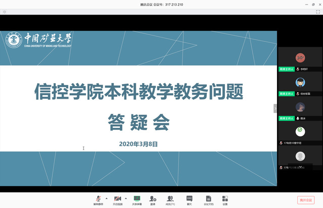 为响应教育部“停课不停学”的号召,着力帮助解决同学们选课、退课、毕业等教务方面存在的困惑,信控学院于3月8日上午组织召开本科教学教务问题线上答疑会。信控学院副院长李世银、教学管理办公室刘静、胡忠满受邀出席会议,各年级辅导员、全体本科班级学习委员参加会议,会议由党委副书记张磊主持。