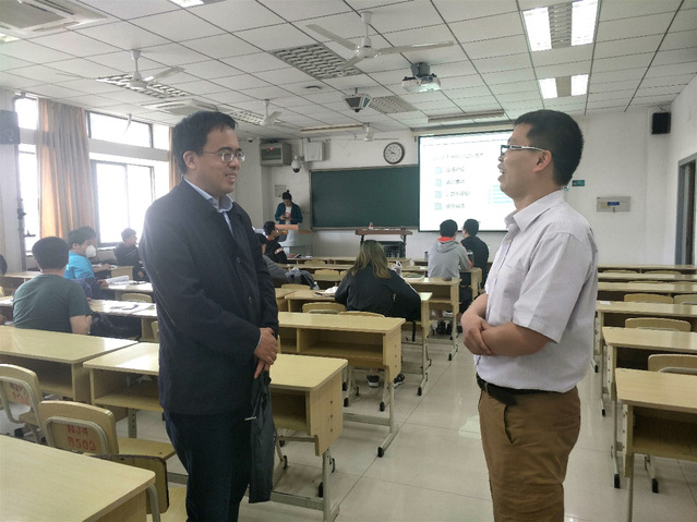 听课过程中,周福宝副校长认真聆听教师授课,细心观察学生上课状态,结合课堂情况做了详细记录。课后周福宝副校长与朱美强副教授、上课的学生们进行了亲切交谈,谈自己的听课体会,充分肯定了任课教师认真的教学态度、清晰的授课思路、学生们良好的学习风貌等,仔细询问了任课教师和学生们在课堂环节存在的困难和问题,并对公教区网络保障提出新的要求。