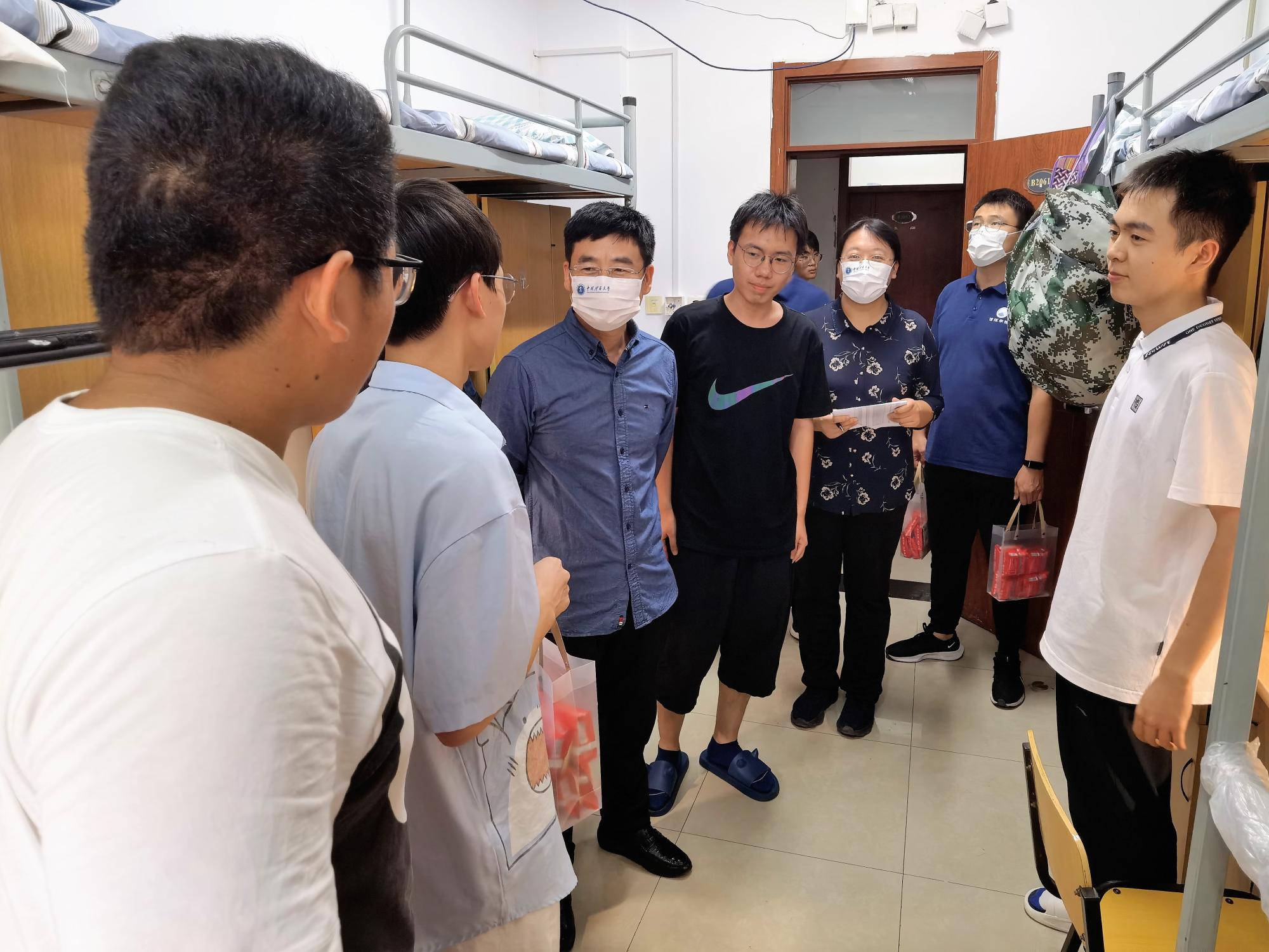 在南湖校区,张磊书记深入松三学生宿舍进行走访慰问,与新生们亲切交谈,了解大家入学以来的学习和生活状态,特别询问了同学们生活上是否适应、有什么困难,叮嘱大家一定要树立安全意识,疫情防控不能放松;养成良好的生活习惯,保持干净整洁的居住环境。他强调,要调整好心态,尽快适应大学学习,积极参加文体活动,开启健康充实的大学生活。翟文艳副书记与同学们聊起了家乡的风土人情,为新生介绍了徐州的气候和地方特色。