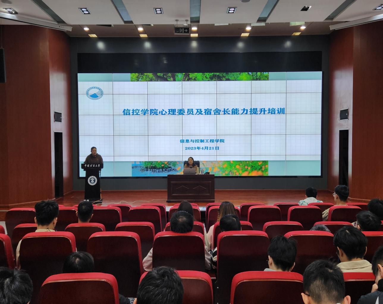 为进一步提升学生骨干心理健康工作水平,助力广大学生良好班级、宿舍氛围的营造,按照学院2023年春季学期系列教育引导活动安排,信控学院于4月21日晚在学院A101报告厅举办学生心理骨干能力提升培训讲座。讲座由校大学生心理健康教育中心张金健老师主讲,由学院学工办主任管钰老师主持。2022级辅导员李非及学院各年级心理委员、宿舍长参加了讲座。