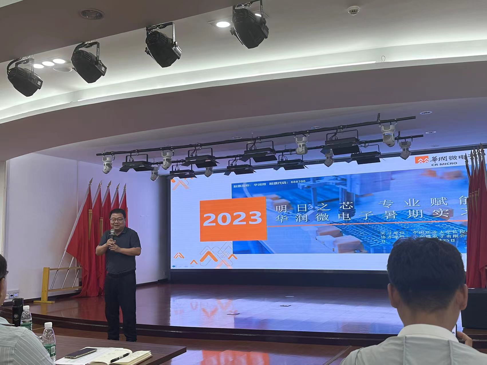在25日下午的进行的2023年度电子信息工程专业生产实习的结班仪式中,全体老师和华润相关领导一同听取了9组45位同学的实习汇报并进行了点评。