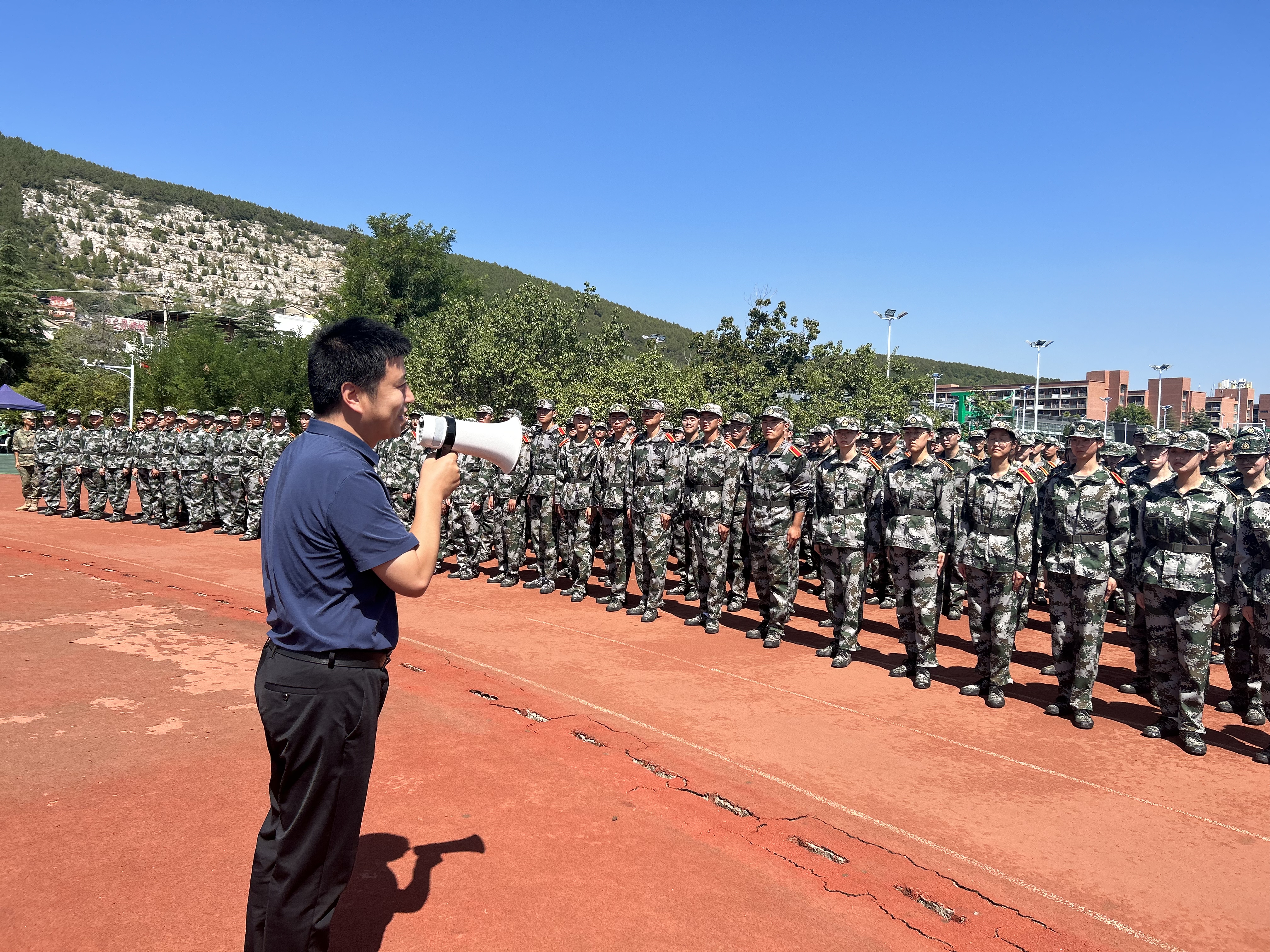 在军训现场,程德强对承担本次军训任务的各位教官表示感谢,并致以亲切问候。他对同学们高昂的军训热情及良好的精神面貌表示赞许,期盼同学们发扬人民军队不怕苦、不怕累的优良传统,增强纪律观念及团队协作意识,将军训中磨炼的优良品质融入到今后的学习和生活中去。他强调,希望通过军训增强学生的国防意识、国防观念和国家安全意识,厚植爱党爱国爱军情怀。他鼓励参训学生挑战自我,服从教官指挥,高质量完成军训任务,同时叮嘱同学们要守好安全底线,关注自身健康,如有身体不适等情况,要及时报告。