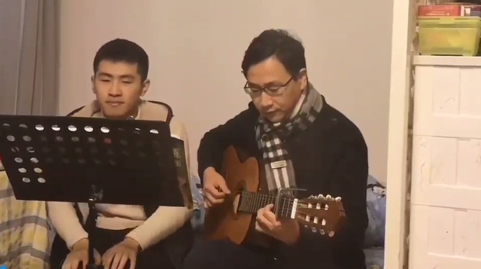 同学正与家人弹吉他唱歌