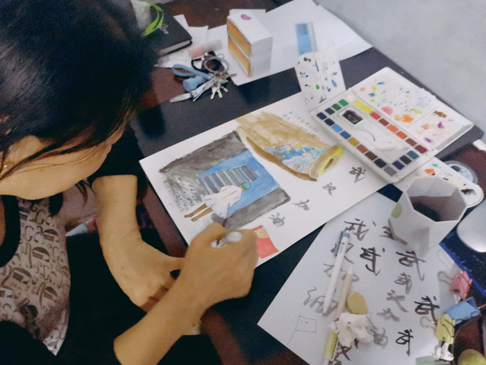 同学正与家人完成作品