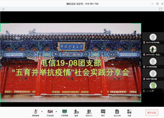 电子信息类19-8团支部举行“五育并举抗疫情”寒假实践交流线上班会