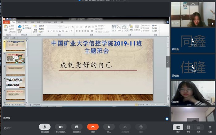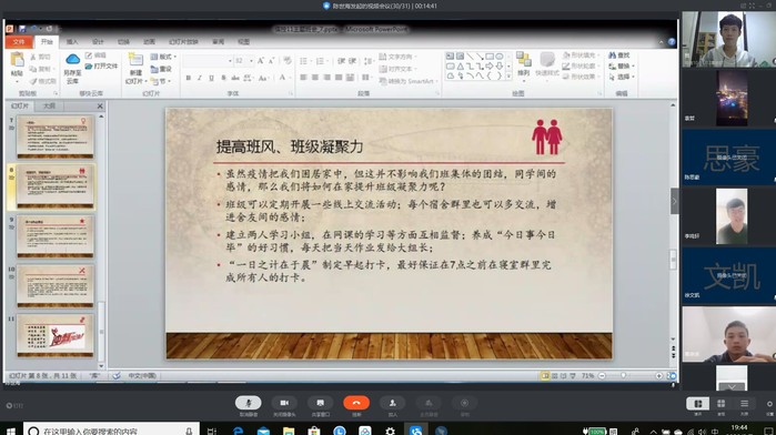 为了了解每位学生疫情期间居家的具体情况,并积极落实防疫的宣传工作。3月9日晚上7点,信控学院19-11班举行了“成就更好的自己”线上主题班会,本次班会由班主任陈世海组织,并且邀请了信控学院19级辅导员李鸣轩出席,11班全体学生参加了本次会议。