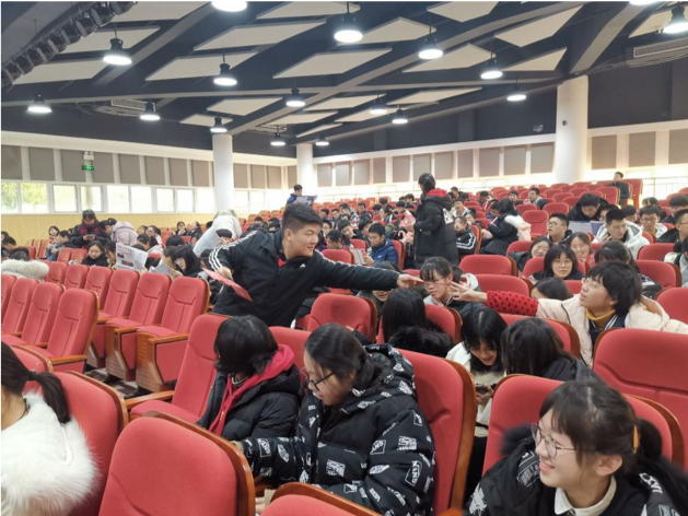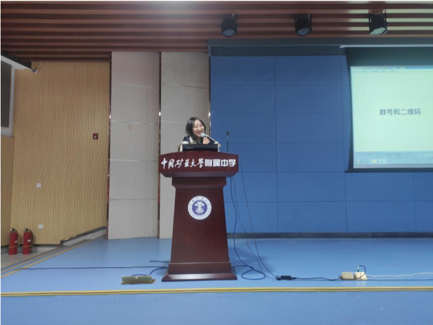 14时30分,小队按计划抵达矿大附中。在设备调控和宣讲幻灯片拷贝完成后,两位同学去看望了恩师,并在校内寻找了几个合适的地点以张贴矿大宣传海报。16时整,宣讲会在讲习堂正式开始,矿大附中全体高三学生到场参加,教导处副主任赵祥伟老师出席了活动。在分发矿大招生宣传手册及小礼品后,王恺如同学播放了结合自己大学生活照片制作的快闪视频,起到了良好的暖场作用,吸引了同学们的目光。