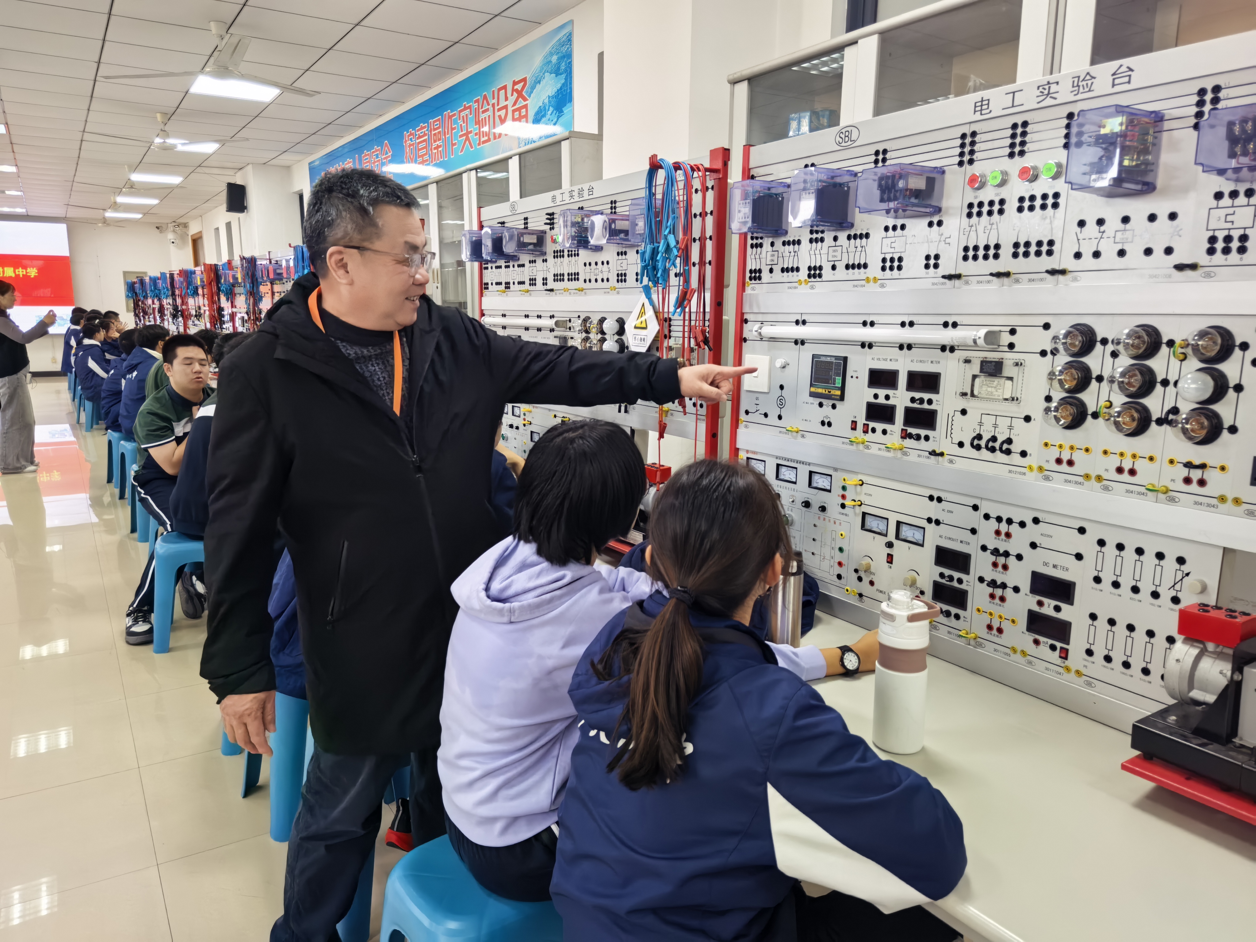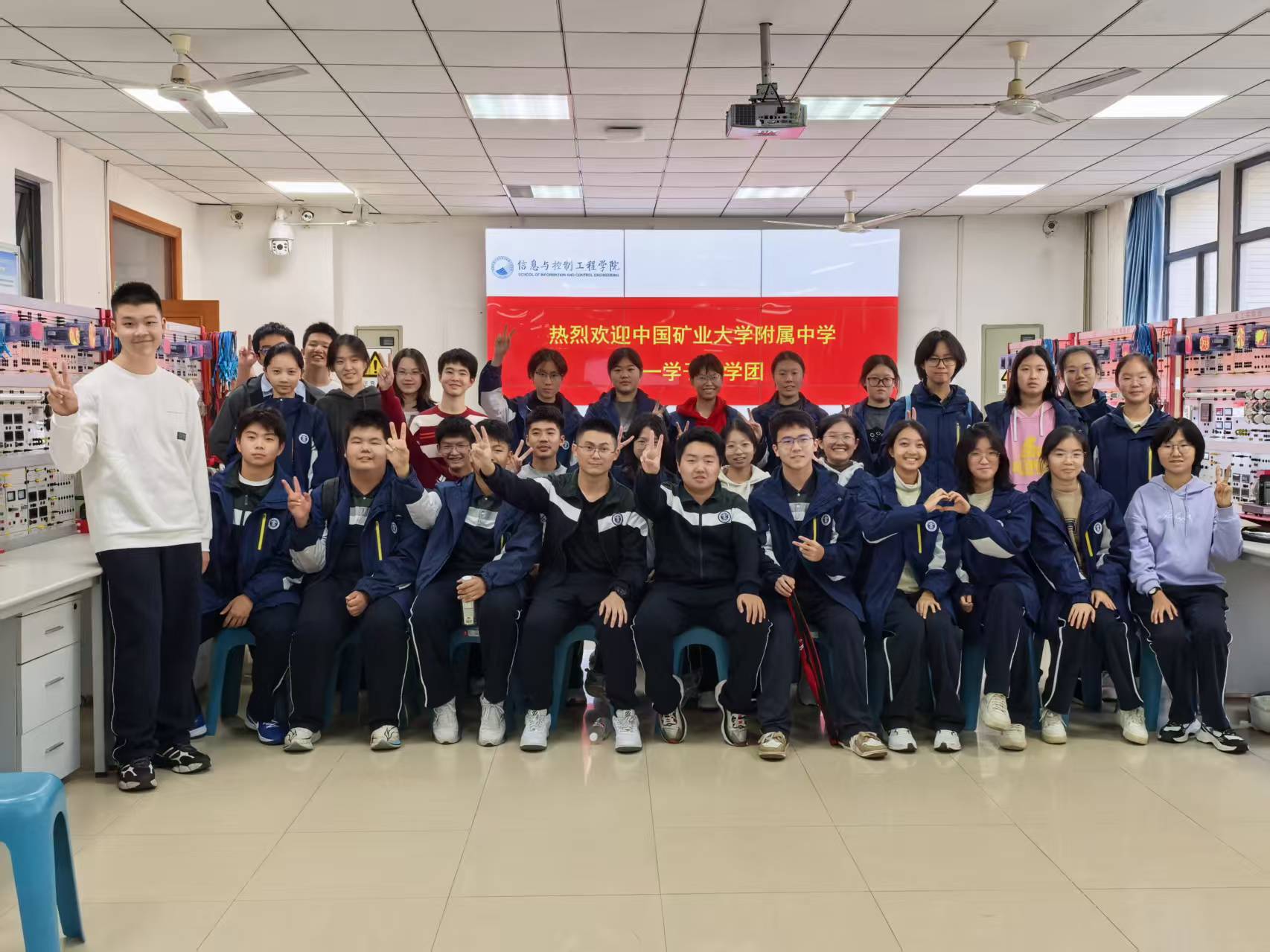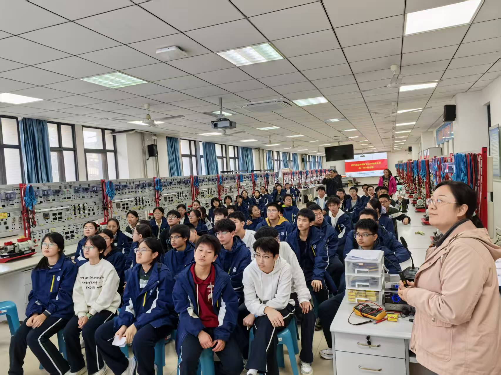 附属中学高一学子120余人来到信控学院电工电子国家级教学示范中心。实验室与设备管理处副处长辛良,学院副院长刘海、副院长陈平,学院关工委常务副主任王香婷、关工委委员邹南,学院实验中心相关教师等参加活动。