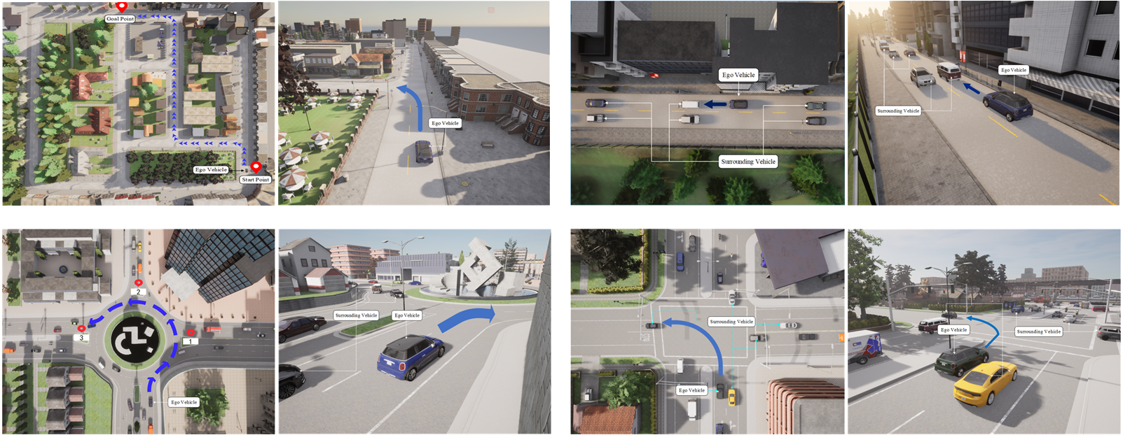 图2 在CARLA自动驾驶平台上的空旷道路行驶、拥堵公路跟车、拥堵环岛绕行以及拥堵十字路口左转驾驶效果