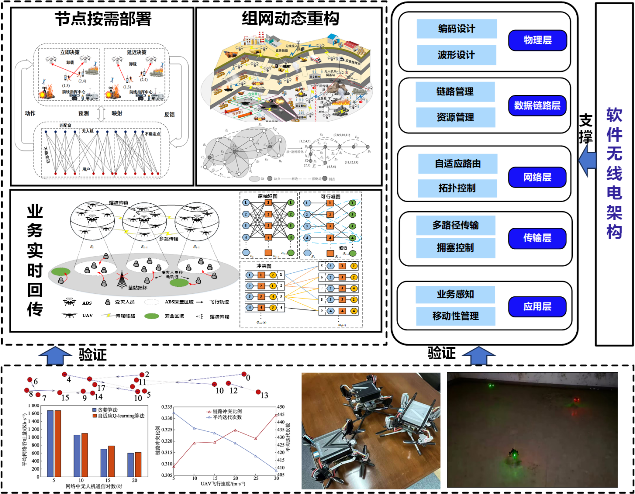 针对地下空间、高层建筑等复杂环境灾后应急场景中覆盖需求突发、网络拓扑快变、应急业务并发等挑战,发挥无人机集群全地形灵活部署、动态重构与实时响应等方面的优势,研究场景认知的无人机按需部署、无人机自适应拓扑控制与基于业务优先级的确定性资源调度方法,基于软件无线电架构设计了统一的通信协议栈并搭建了复杂环境无人机应急通信网络半实物仿真平台,形成了韧性可重构、柔性自适变的无人机集群自适应组网理论体系与技术方案,有效解决了复杂环境灾后应急场景网络优化策略难以根据环境变化快速调整的瓶颈性问题。