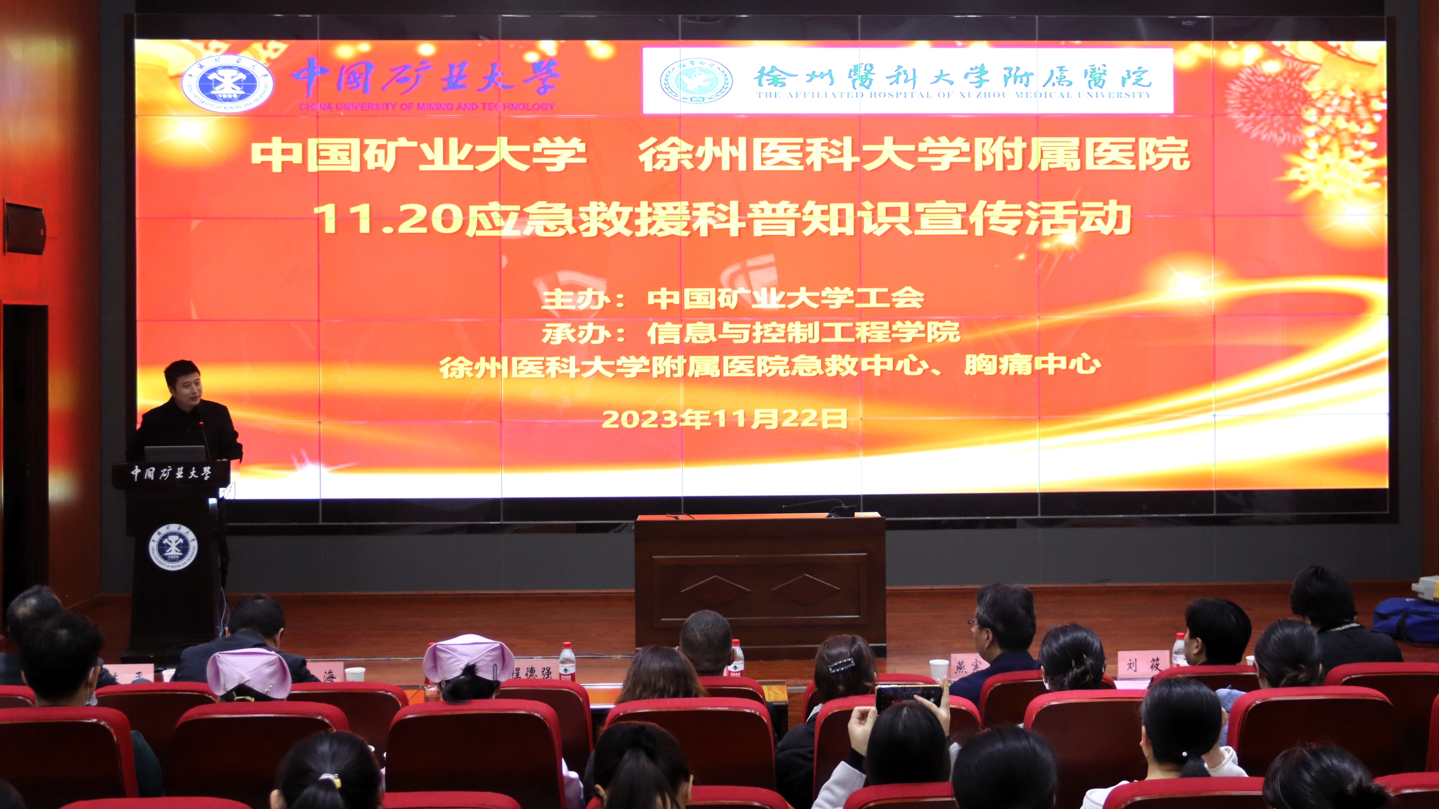 与徐州医科大学附属医院承办的“守护健康,从‘心’开始—11·20应急救援科普知识宣传活动”在学院报告厅举行。徐州医科大学附属医院副院长燕宪亮,校工会主席陈仲元,院党委书记程德强、副书记翟文艳,副院长刘海、陈平出席,附属医院相关科室主任、医务人员,以及来自全校各单位的300余名师生参加。