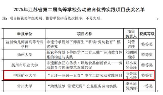 近日,江苏省高等教育学会公布了2025年江苏省第二届高等学校劳动教育优秀实践项目评选结果(苏高教会(2025)28号),学校推荐的5项实践项目全部获奖,其中特等奖1项、一等奖1项、二等奖3项。禁忌书屋